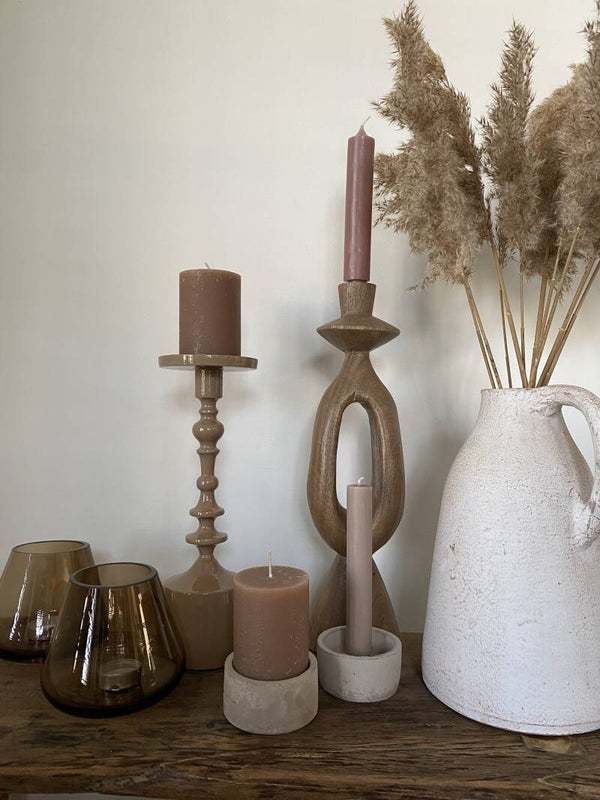 Deze stoere kandelaar is gemaakt van beton. De warme terra kleur geeft een mooie uitstraling en past eigenlijk bij elke kleur kaars. De kandelaar is geschikt voor dinerkaarsen en stompkaarsen.